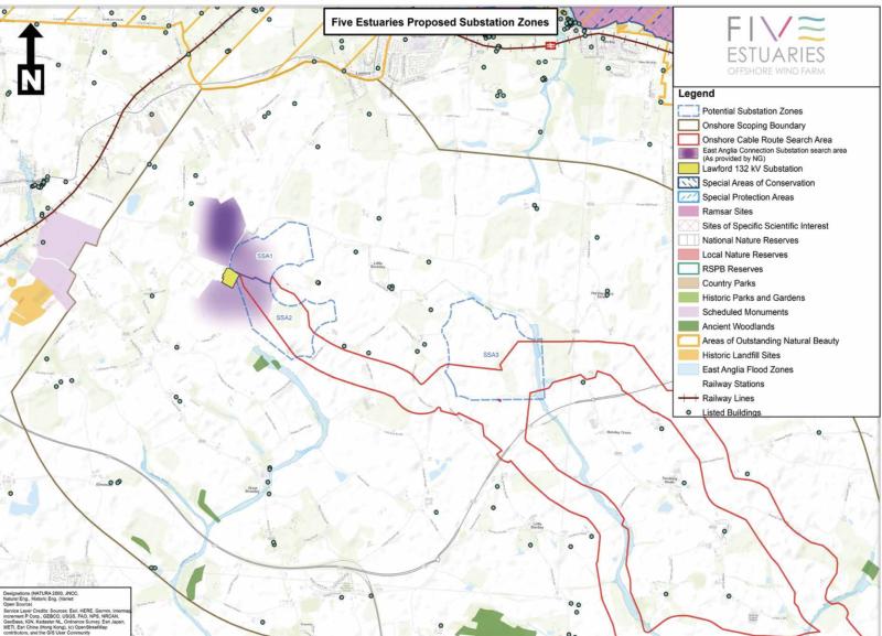 Five Estuaries has published a map showing its proposed cable routes and options (3 being considered) for Substation location. These all impact Little Bromley. See below.