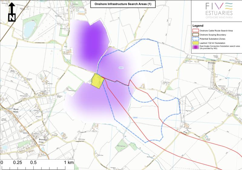Five Estuaries Offshore Windfarm is one of the offshore energy providers that National Grid is expecting to connect into their proposed East Anglia Green Energy Enablement Connection Substation. National Grid are proposing to locate their substation near the existing Lawford Substation site at the Ardleigh Road/ Grange Road junction on the edge of Little Bromley. We have been advised that the Five Estuaries substation would be around 1km from the National Grid substation.