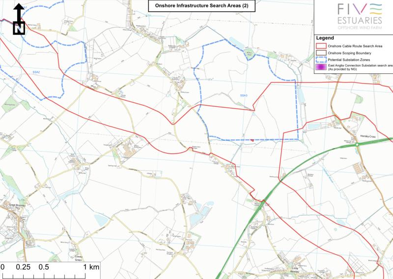 Five Estuaries has received requests to provide maps showing their cable search areas and substation search areas at a larger scale. They have now published these on the project website: www.fiveestuaries.co.uk/consultation . The maps which especially affect Little Bromley are shown.