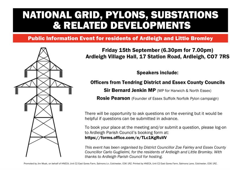 We would like to make you aware of a Public Information Event to be held on Friday 15th September at Ardleigh Village Hall - 18:30 for 19:00 start. This Event has been organised to share the latest on National Grid, North Falls, Five Estuaries and Tarchon energy infrastructure proposals for Little Bromley and Ardleigh. We are expecting updates from Tendring District Council and Essex County Council as well as from Sir Bernard Jenkin MP and Rosie Pearson from Essex, Suffolk and Norfolk Pylons. There will also be a Question and Answer session. You will need to book a place at the meeting and submit any questions in advance — see details below. Please attend if you can. You can book your place and submit a question using this link.